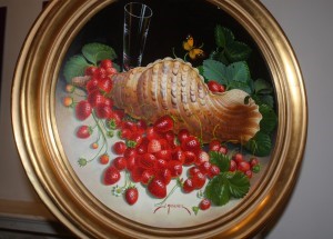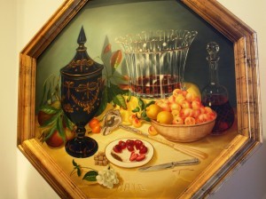 Among his salient skills at the easel is his thrillingly naturalistic reproduction of luminous glassware, ceramics and foliage.